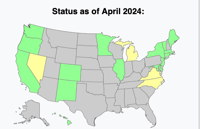 Look at the map. The green states have enacted the NPV. It is pending in the yellow states and not being considered in the gray states. It is surprising that the NPV has not been passed in Michigan where the democrats control both legislatures and the governor’s office. North Carolina has a republican legislature and a democrat governor (which is unlikely to change). Virginia has a republican governor and a democrat legislature. Nevada has a republican governor and a democrat legislature. Michigan’s 15 electoral votes would bring the NPV total to 224. Although there is a mathematical chance that the NPV might reach 270, the odds are slim.